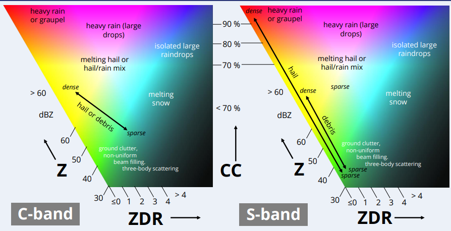 The idea is that 3 polarimetric variables are mapped to the R, G and B channels, which allows to highlight meteorological features in a single figure. The authors provide the following interpretation key